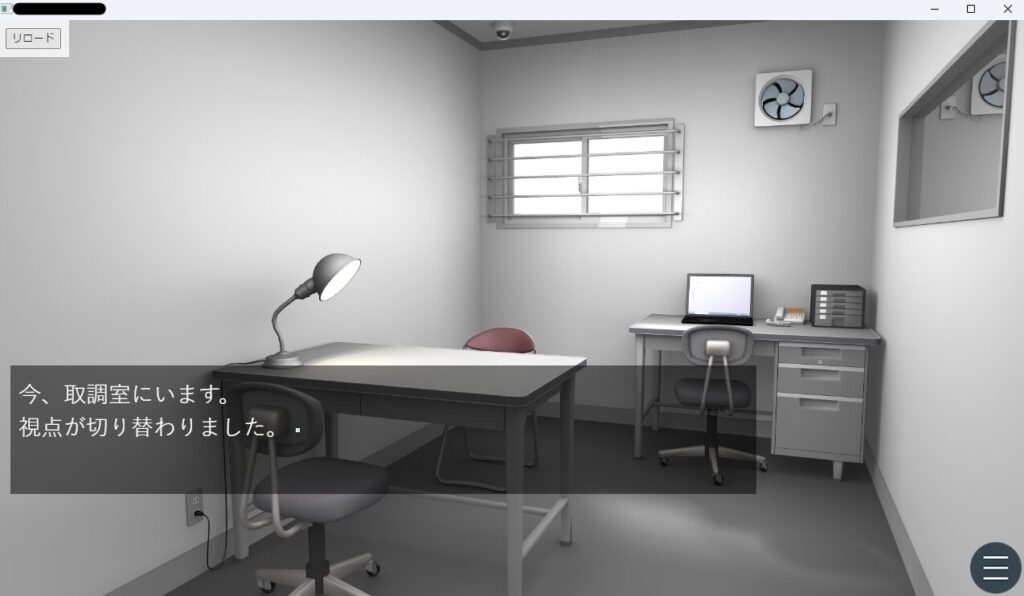 今回は、先に表示させた取調室から視点を変えて、入り口側から見た視線の画像に切り替えてみます。